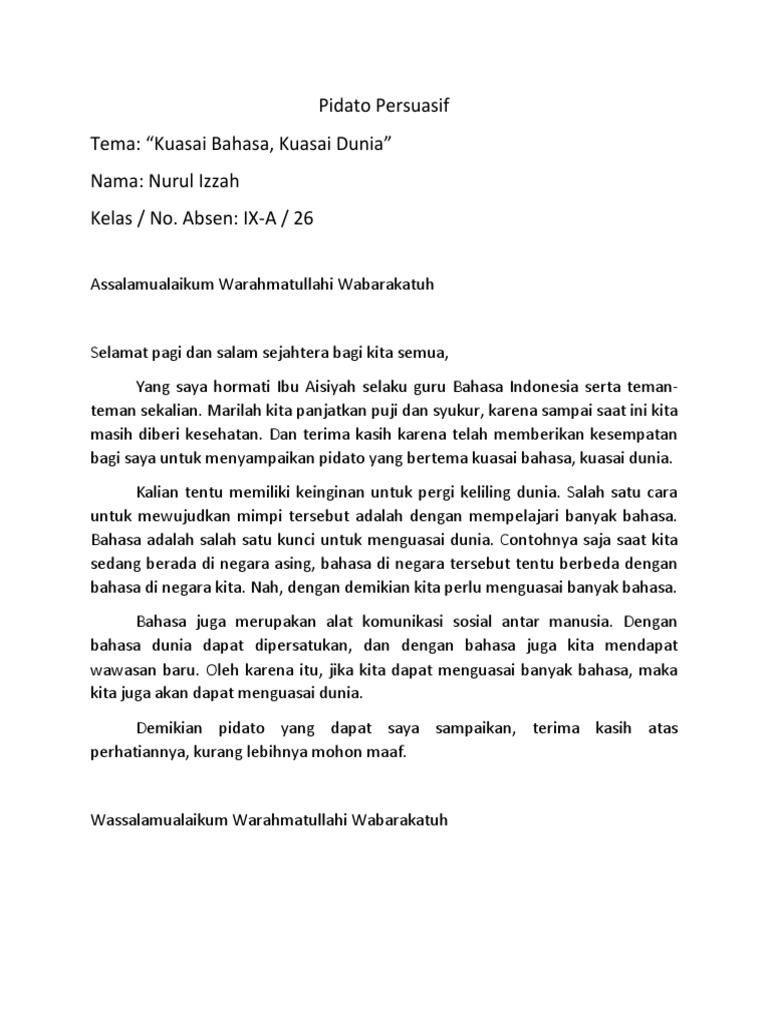 Kami percaya bahwa bahasa adalah kunci untuk menguasai dunia. Kuasai Bahasa Inggris Maka Kau Akan Menguasai Dunia. Contoh Pidato Singkat persuasif terbaru lengkap Mungkin sewaktu Anda duduk di bangku Sekolah Dasar Anda sudah dikenalkan dengan yang namanya pidato persuasif.
