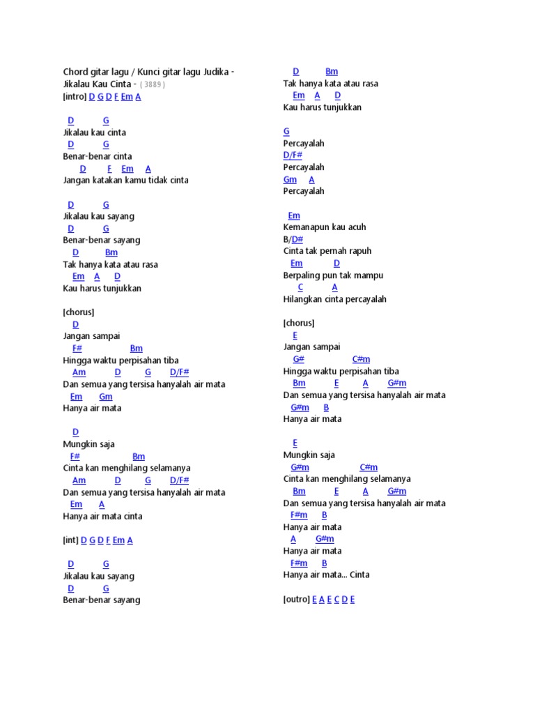 Chord Gitar dan Lirik Lagu Jikalau Kau Cinta - Judika. Chorus D Jangan sampai F Bm Hingga waktu perpisahan tiba Am D G DF Dan semua yang tersisa hanyalah air mata Em Gm Hanya air mata. Lirik dan Chord Kunci Gitar Jikalau Kau Cinta - Judika.