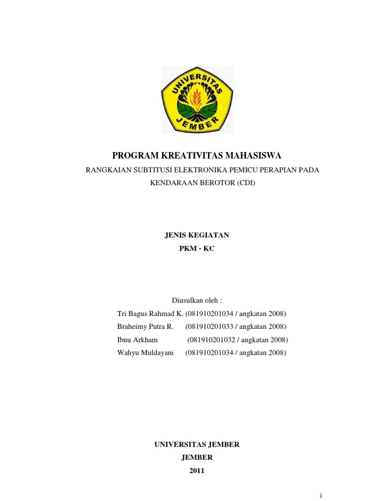 Download Contoh Proposal Pkm Kc Lolos Pimnas PDF 1200 MB - SamPDF. Contoh Judul PKM KC yang Didanai Oleh Dikti Ada 13 contoh judul PKM KC yang akan dibagikan diantranya sebagai berikut. Sistematika penulisan artikel pkm-p pkmt dan pkmkc Artikel dibatasi maksimum 10 halaman nomor halaman diletakkan di bagian kanan bawah setiap halaman diberi header berisi nama belakang penulis pertama dan judul artikel serta.