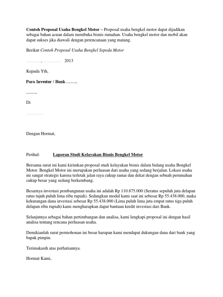 Menciptakan lapangan pekerjaan yang madiri dan berkesinambungan. CONTOH PROPOSAL USAHA BENGKEL MOTORdocx. Usaha Bangkel Motor Cahaya Motor ini merupakan usaha perseorangan yang didirikan sejak tahun 2010.